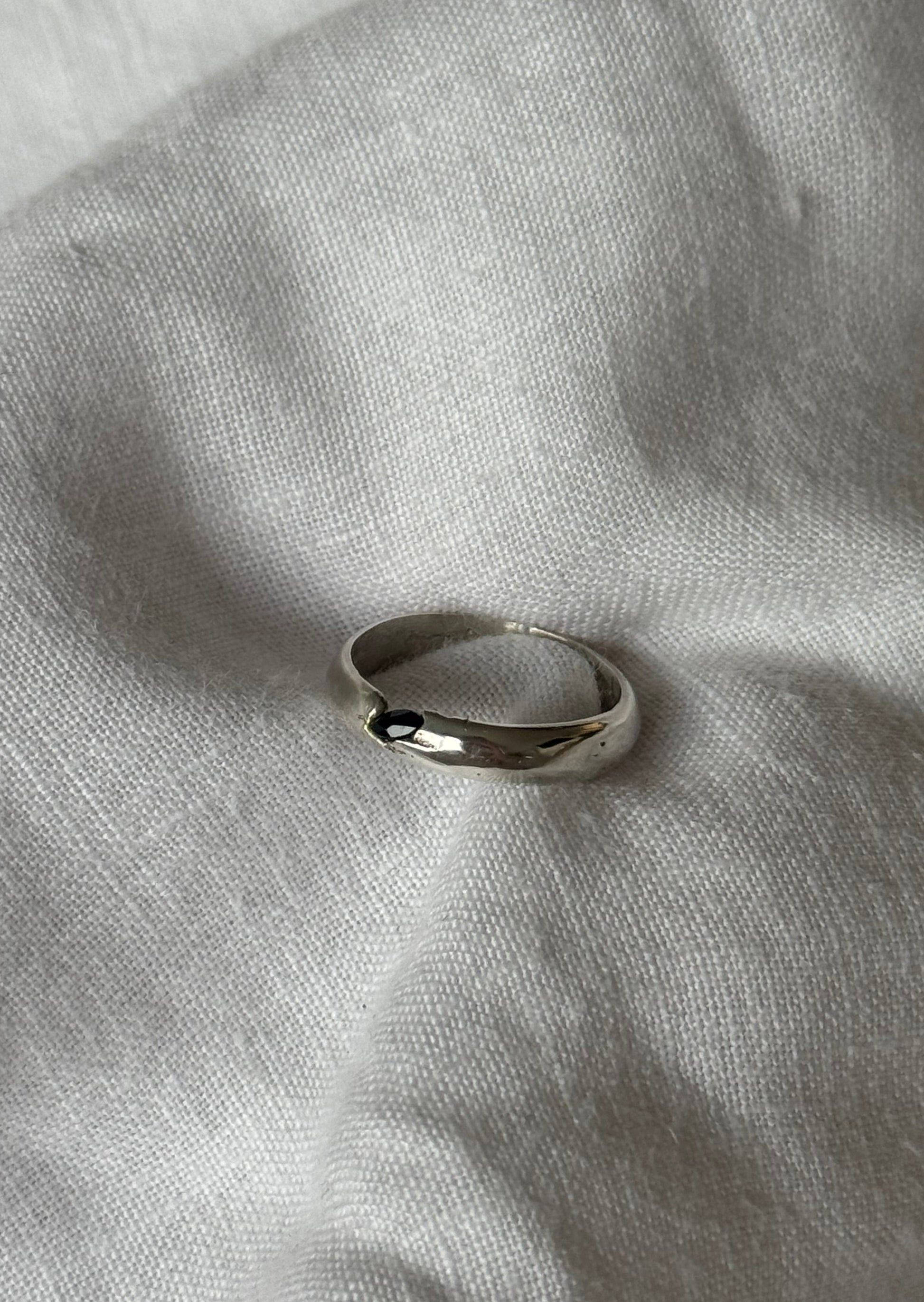 This bespoke band features a Sapphire cast in place into recycled sterling silver, hand polished to create a beautifully timeless piece.