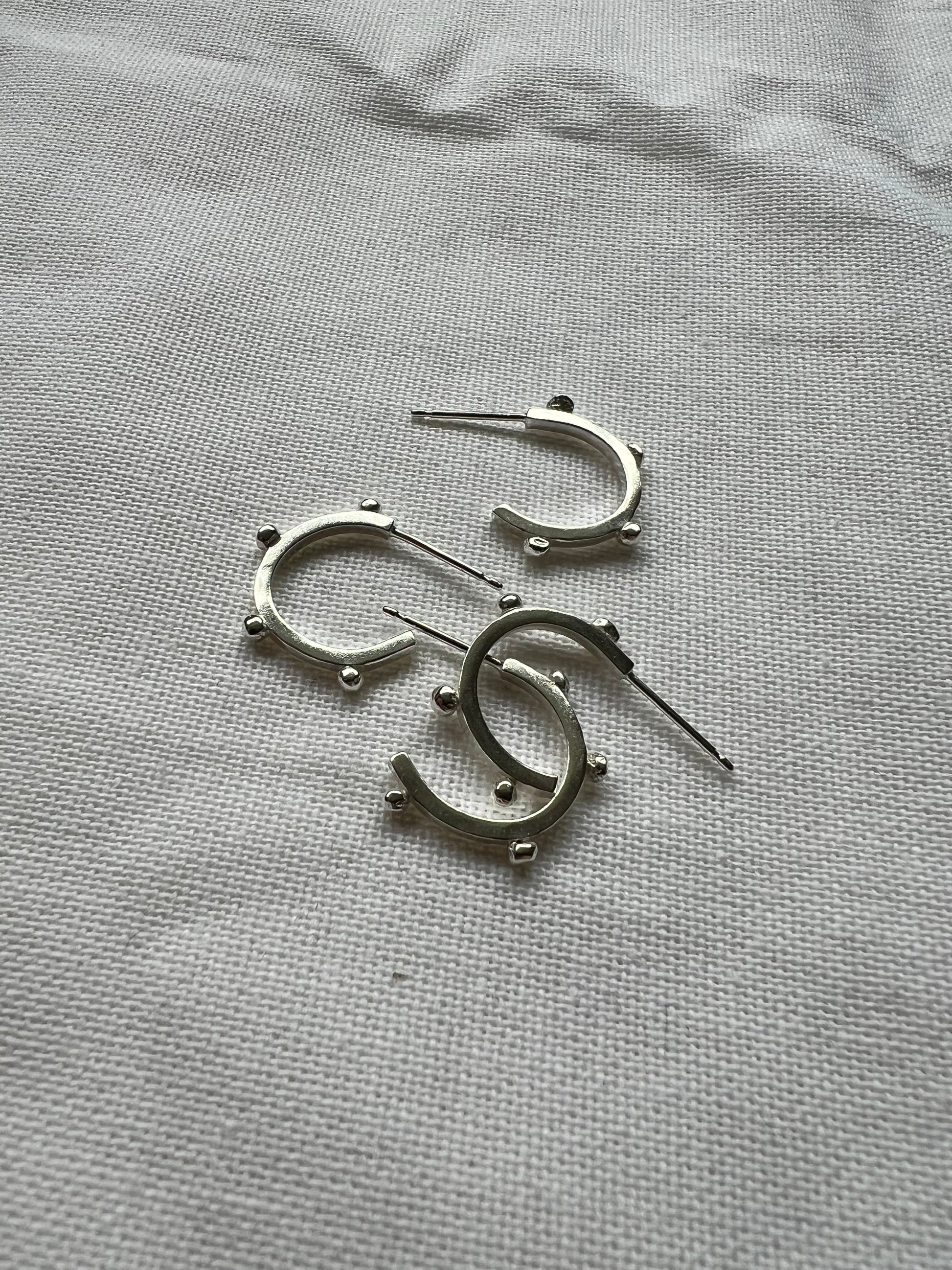 An earlobe hugging hoop to add shine and style to your everyday look. These hoops are made from 1.5 sterling silver square wire with melted studs to contrast. These also come in a bigger size if you’re looking to make more of a statement.
